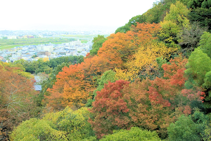 - 男山の山頂付近にある展望台からは、眼下に広がる木津川・宇治川・桂川の三川合流地点とともに、色づく京都盆地を一望できる絶景を楽しめる。