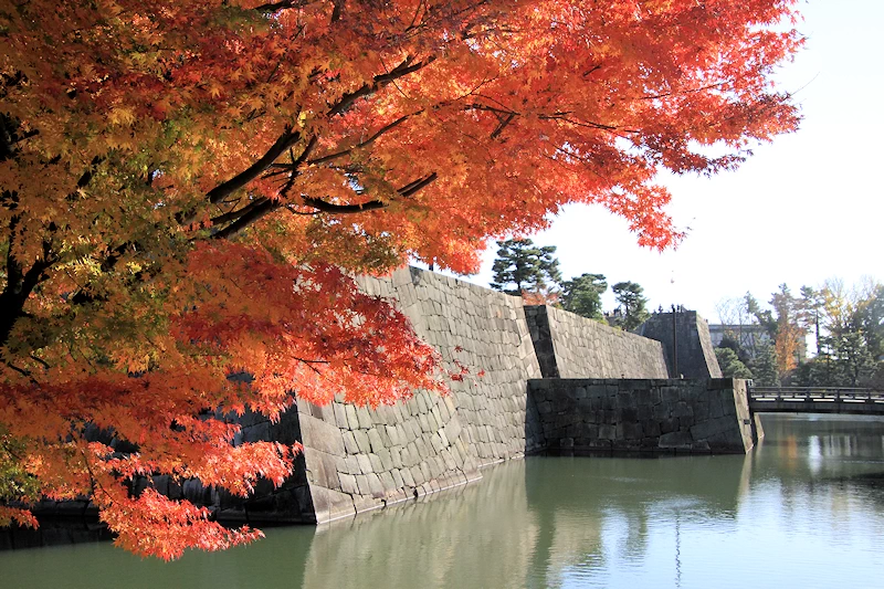 - 二条城三庭園の一つ二の丸庭園は小堀遠州が手掛けた池泉回遊式庭園。池の周囲を彩る紅葉が水面に映り込み、国宝・二の丸御殿を背景とした絶好のフォトスポットとなる。