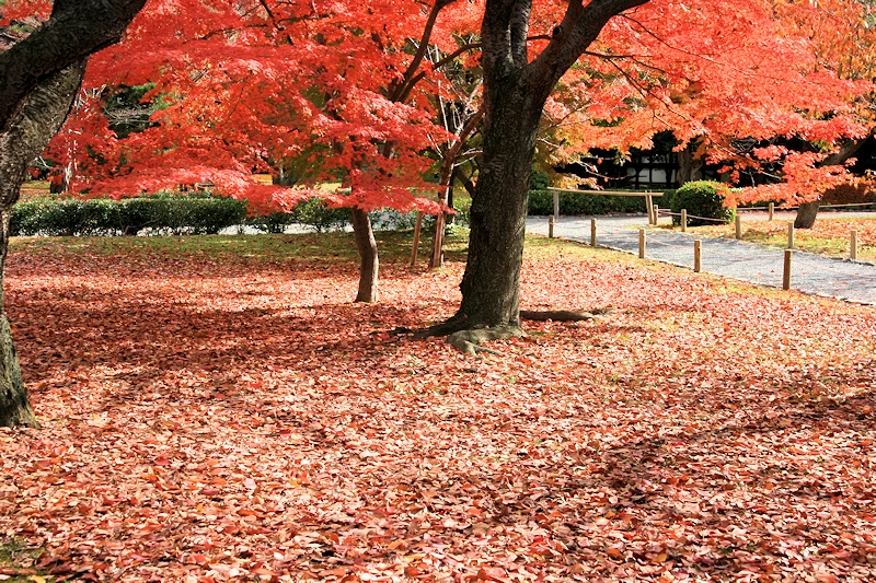 - 二条城三庭園の一つ清流園は城内北側に位置し、和洋折衷の庭園にモミジやドウダンツツジが鮮やかに色づく。特に「もみじの小径」付近は密度の高い紅葉を楽しめる人気スポット。