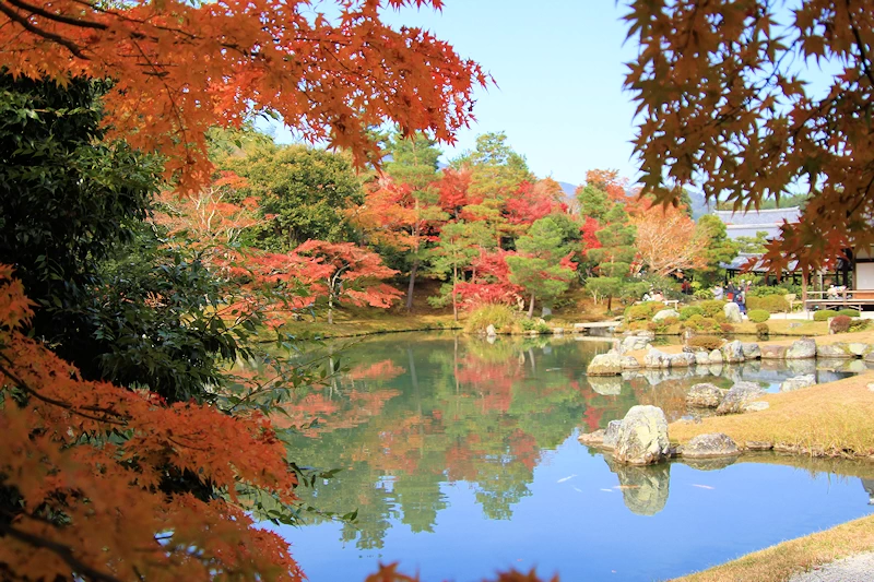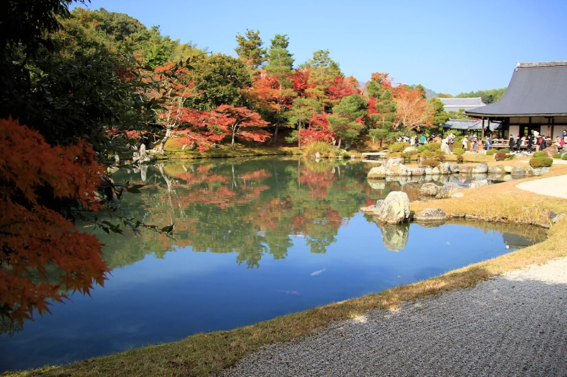 - 曹源池庭園の背後にある嵐山や亀山がそのまま庭の一部のように見え、山全体の紅葉と庭園のカエデが一体となったダイナミックな景観を楽しめる。