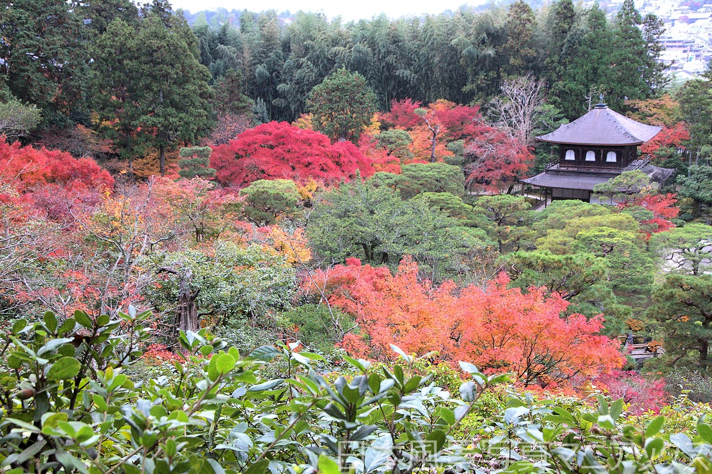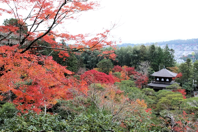 - 境内の奥にある高台へ登ると、紅葉に包まれた銀閣寺の全景と、その先に広がる京都市街を一望できる。