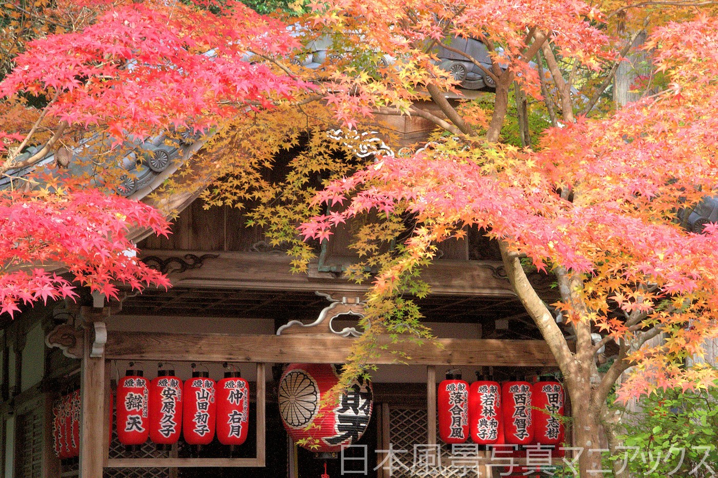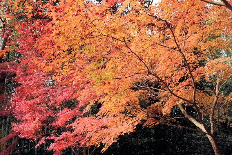 - 山門をくぐると、社殿へと続く参道を両側から覆い尽くすようなカエデが「紅葉のトンネル」を作り出す。