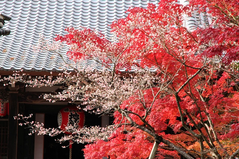 - 例年、地蔵堂付近では紅葉の見頃に「寒桜」が咲き始める。真っ赤な紅葉と可憐な桜が同時に見られる、赤山禅院ならではの貴重な風景。