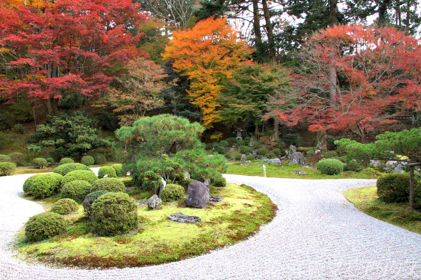 - 大書院前の名勝庭園では、白い砂紋と、霧島ツツジの刈込み、そして燃えるようなカエデが織りなす計算し尽くされた美しさを堪能できる。