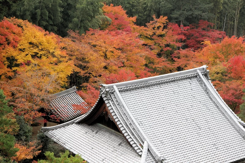 - 裏山の高台へ登ると、色づく境内越しに京都市街を一望できます。紅葉に埋もれるように佇むお寺の姿と、その先に広がる街並みのコントラストは必見。