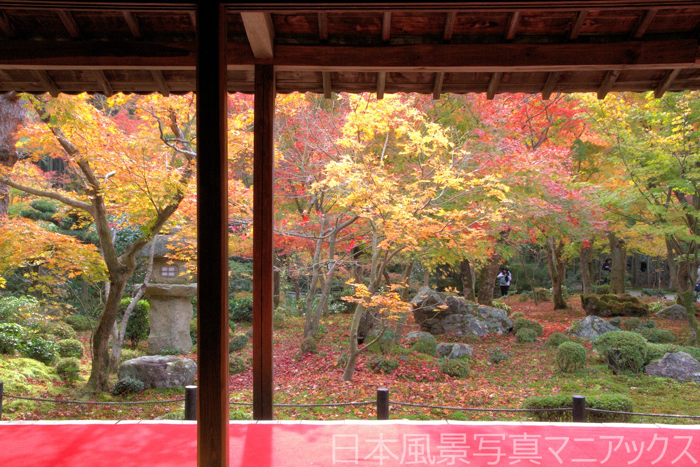 - 晩秋、苔の上に真っ赤な落葉が広がる様子は京都の秋を象徴する光景として知られ、散り際まで美しさを堪能できる。
