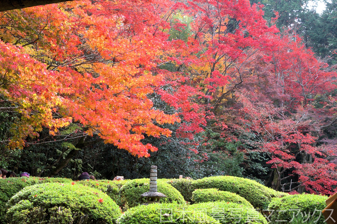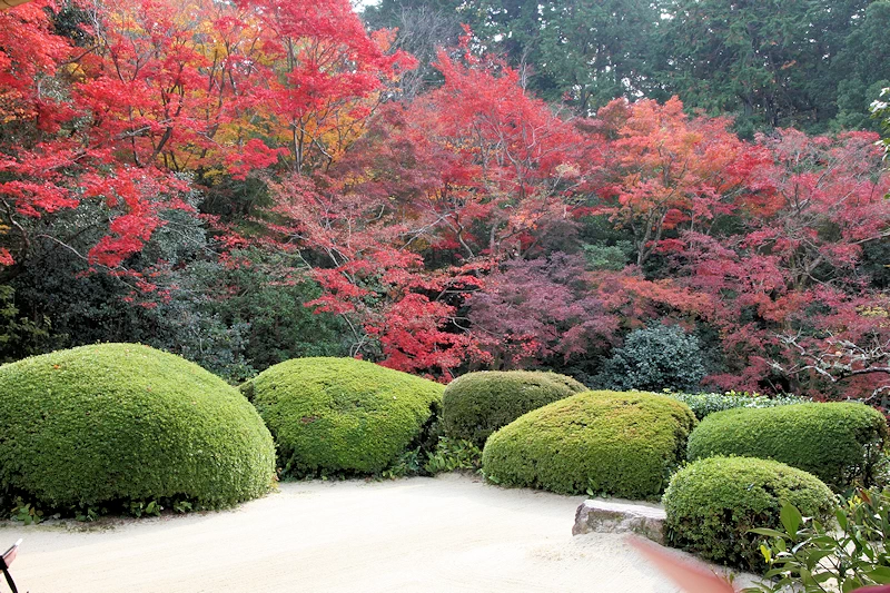 - 「詩仙の間」の畳に座り、柱を額縁に見立てて眺める庭園は一幅の絵画のような美しさ。サツキの刈り込みの緑と、その上に広がる真っ赤なカエデの対比が絶妙。