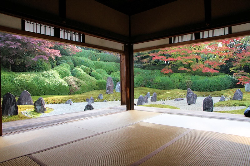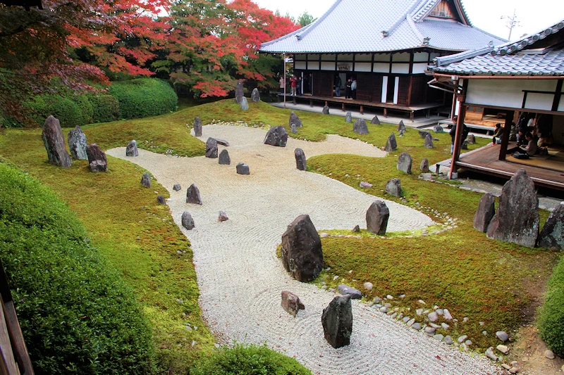 - 立石から放射状に広がる白砂と、鮮やかな緑の苔、そこに赤や黄色のカエデが彩りを添える景色は、まさに色彩の「虹」のよう。