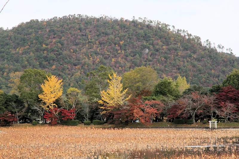 - 日本最古の人工の林泉といわれる広大な池の周囲に約600本以上のモミジが植えられている。風のない日には、水面に真っ赤な紅葉が映り込む「水鏡」の風景が見事。