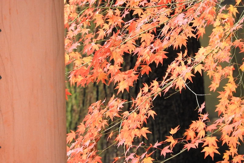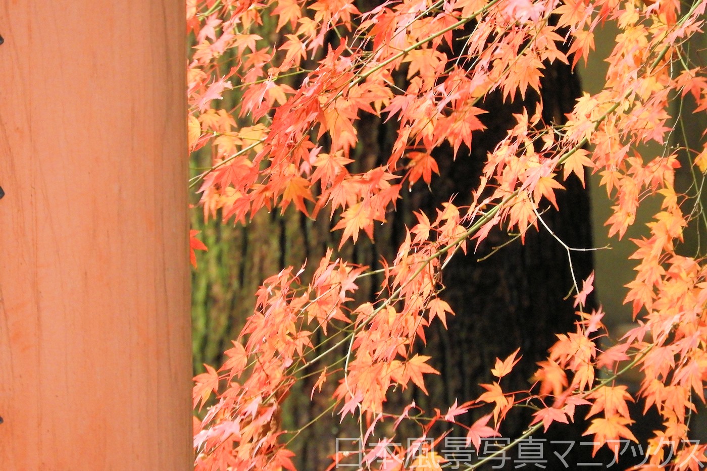 - 楼門や本殿の朱色をカエデが鮮やかに彩る。