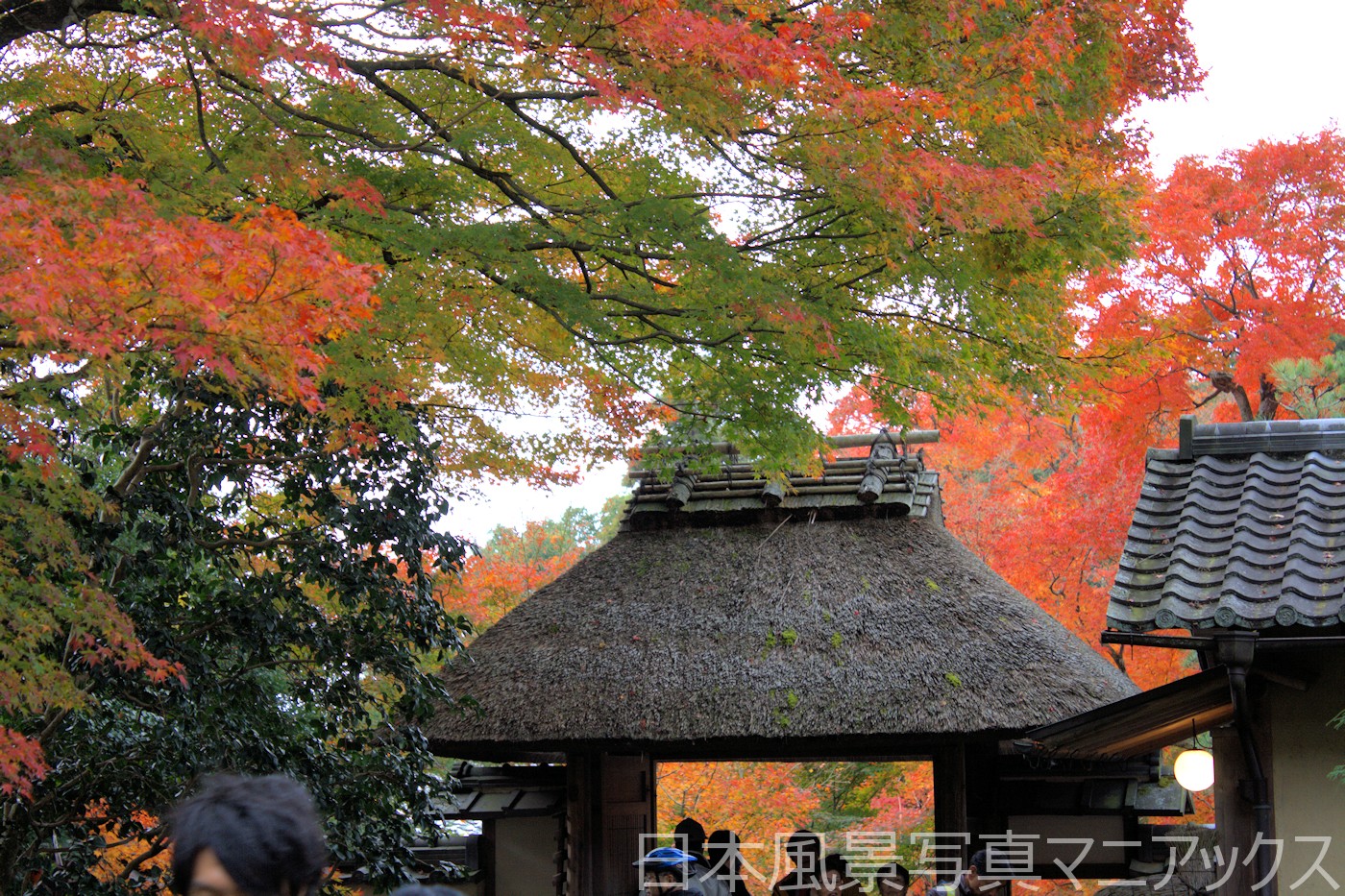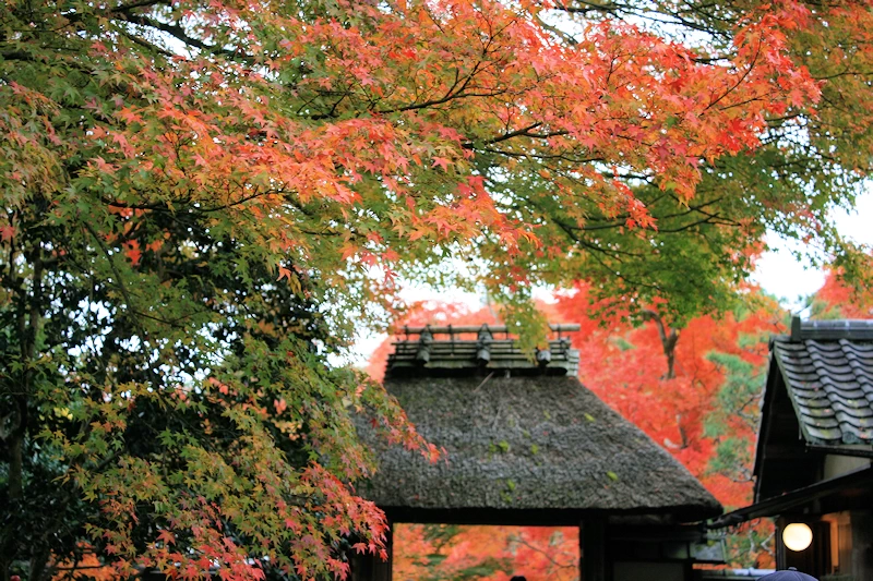 - 最大のハイライトは、茅葺きの山門へと続く石段。門を包むように色づくカエデと趣ある石段の風景は、まるで一幅の絵画のような美しさ。