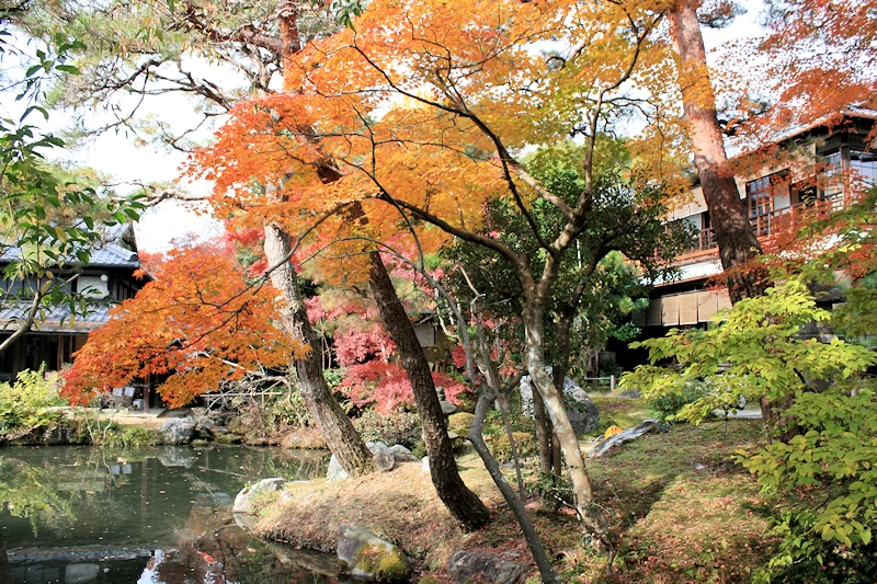 - 庭園の中心にある池の周りをカエデが鮮やかに彩る。存古楼の長椅子に座って眺める紅葉は、一幅の絵画のような美しさ。