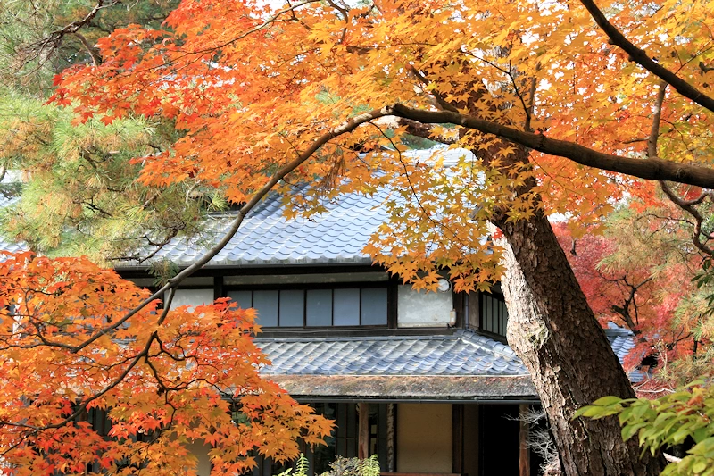 - 美術館(MUSEUM II)の2階テラスからは、色づく庭園越しに比叡山や大文字山を一望できる。