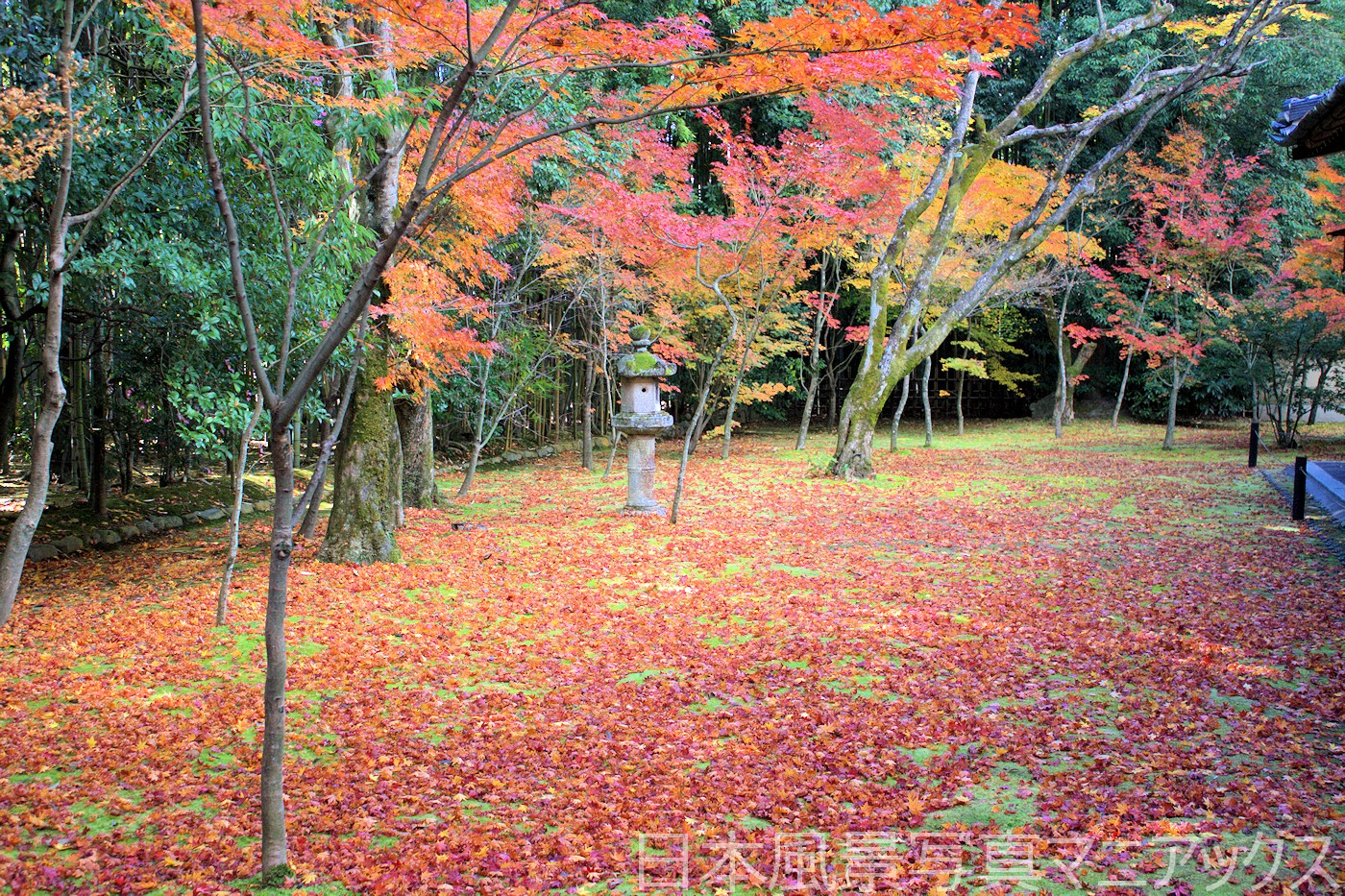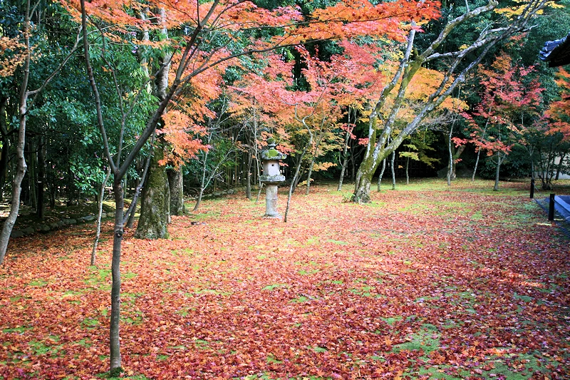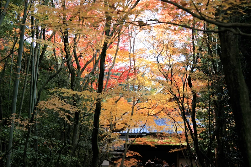 - 山門から続く石畳の参道は、両脇に竹林とカエデが並ぶ。晩秋には石畳一面が真っ赤な落葉で埋め尽くされる光景が有名で、京都を代表する紅葉ポスターのモデルにもなっている。