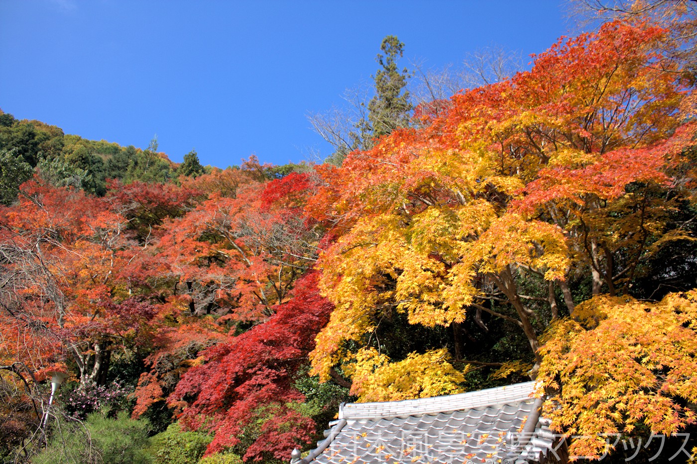 - 山門を包み込むようなボリュームのある紅葉が最大の見どころ。素朴な堂宇に寄り添うカエデが、山寺ならではの風情ある景観を作り出す。