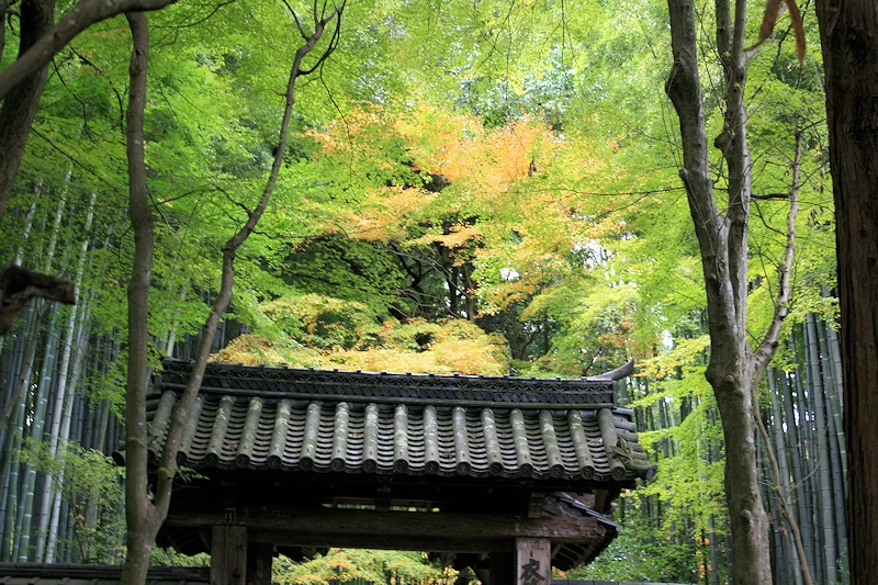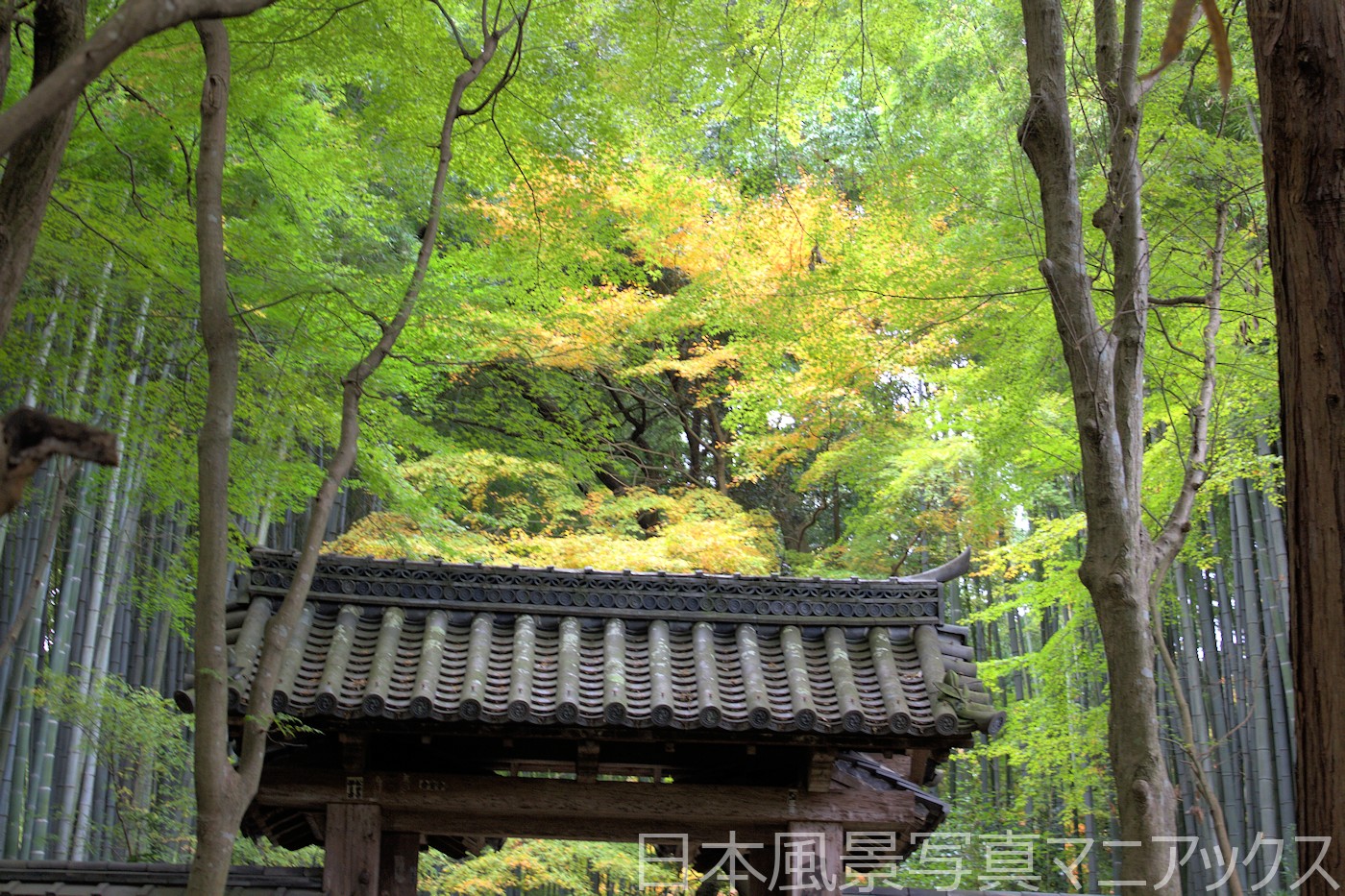 - 総門付近では、門越しに竹林の緑のトンネルと紅葉が重なり合う絵画のような構図を楽しむことができる。