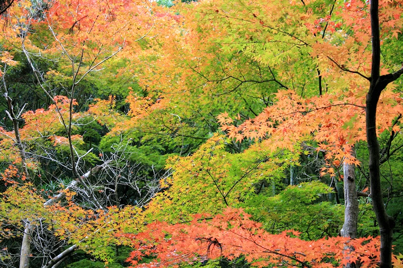 - 参道や境内を埋め尽くす深い竹林。その常緑の鮮やかな緑をバックに、真っ赤に染まったカエデが浮き立つ光景は、京都の他の名所ではなかなか味わえない色彩美。