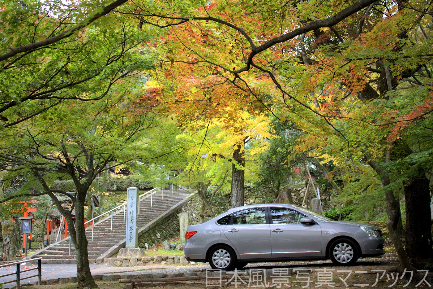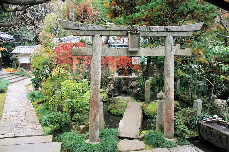- 晩秋には、山門から続く石段にカエデの葉が降り積もり、情緒あふれる敷きもみじの風景を鑑賞できる。