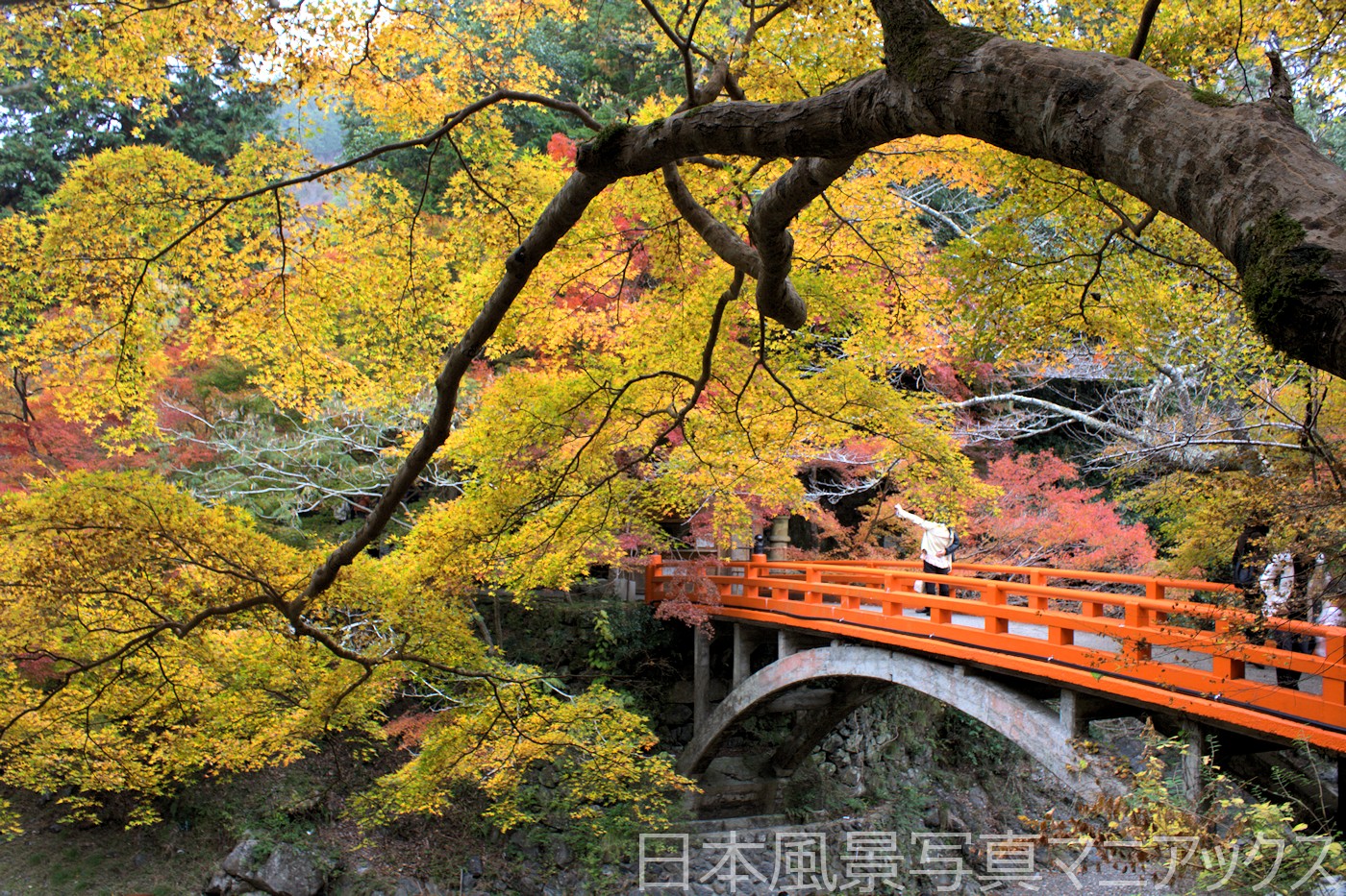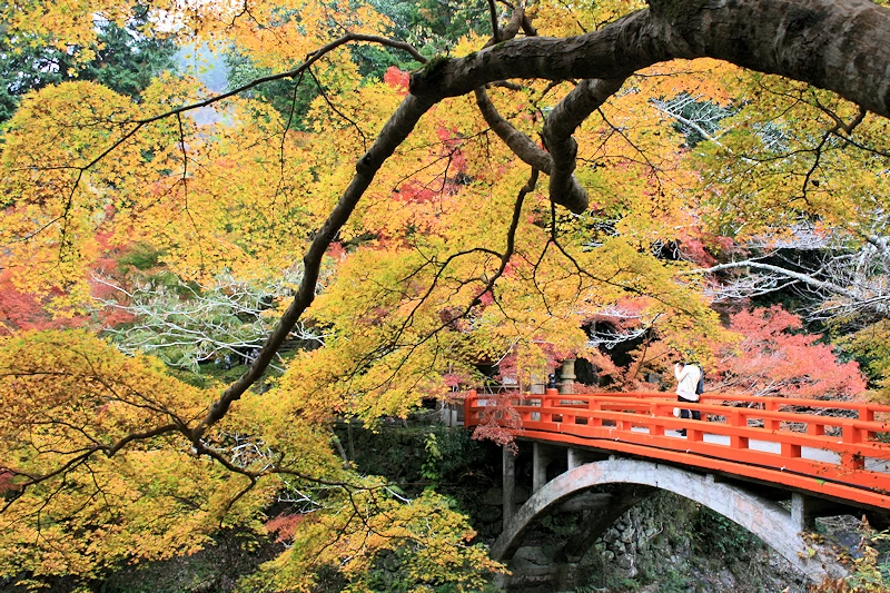 - 参道入口の清滝川に架かる赤い橋「指月橋」。朱塗りの指月橋と周囲を覆う紅葉の調和は、西明寺を象徴する絶景スポット。