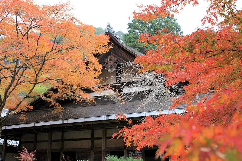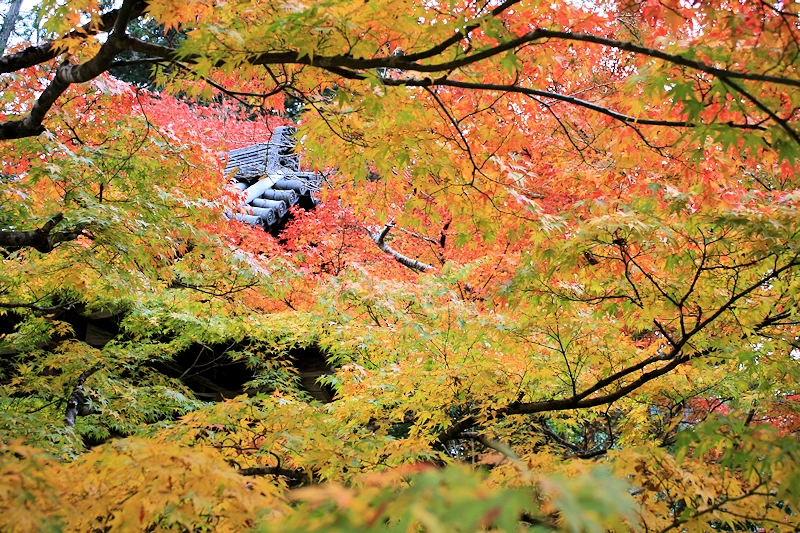 - 山門を抜けると、苔の緑と散り紅葉が美しい庭園が広がる。本堂内からは障子越しに絵画のような紅葉を眺めることができる。