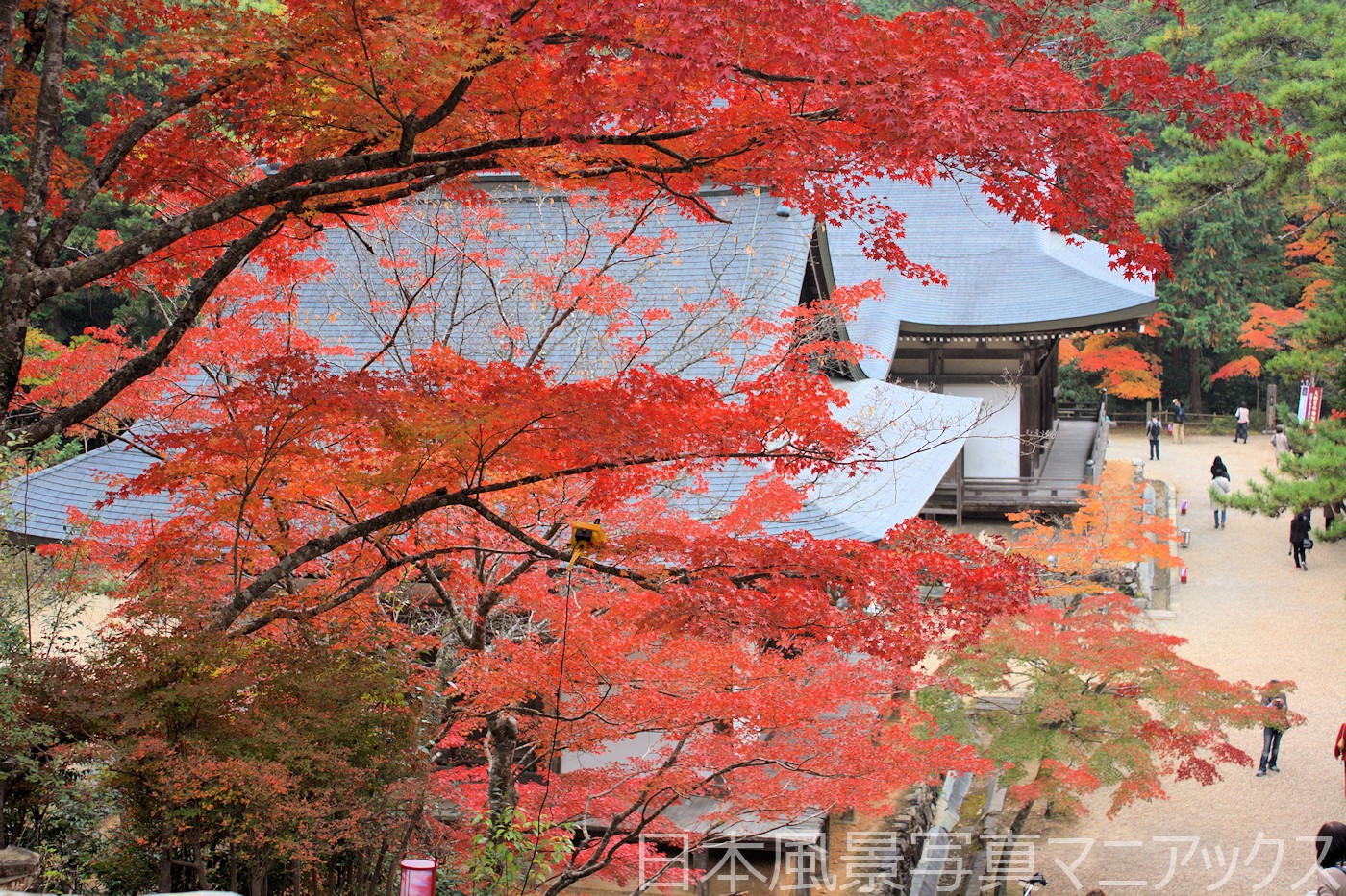- 金堂(本堂)前の長い石段の両脇を紅葉が埋め尽くす光景は、神護寺を代表する絶景。