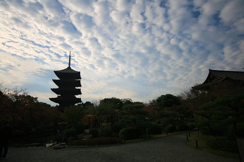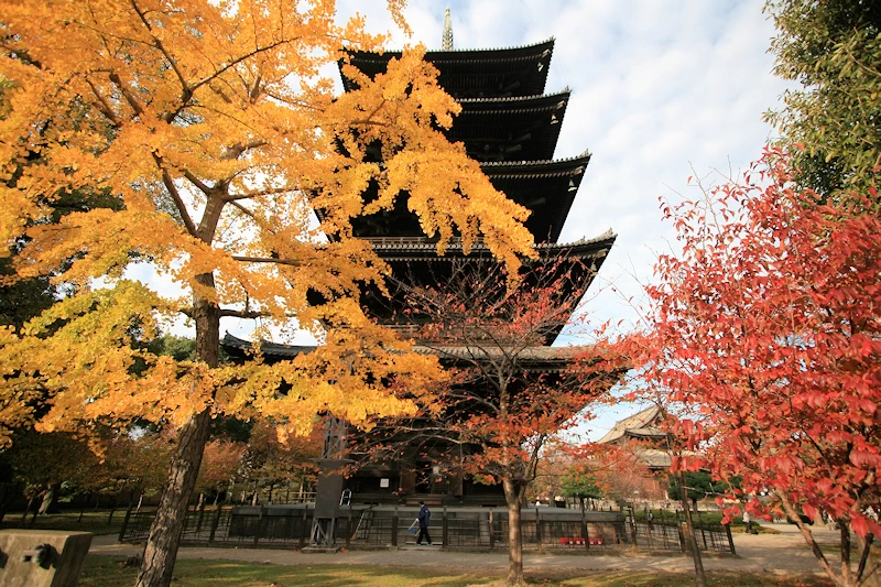 京都のシンボル五重塔で有名な東寺(教王護国寺)。紅葉シーズンは、ライトアップによる幻想的な逆さ紅葉が楽しめることで非常に人気