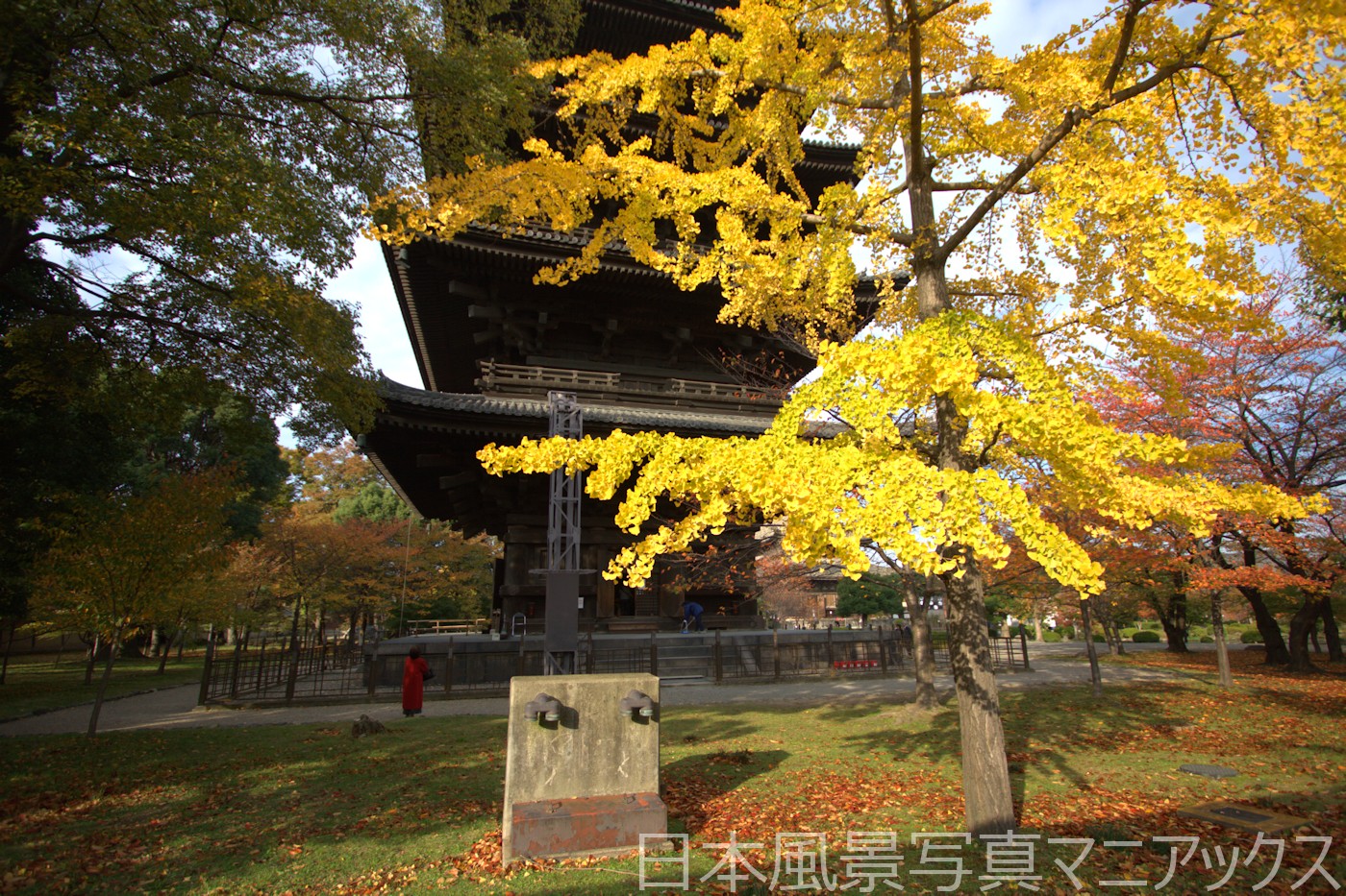 - 境内にある約250本のモミジが、国宝の五重塔や講堂を鮮やかに彩る。
