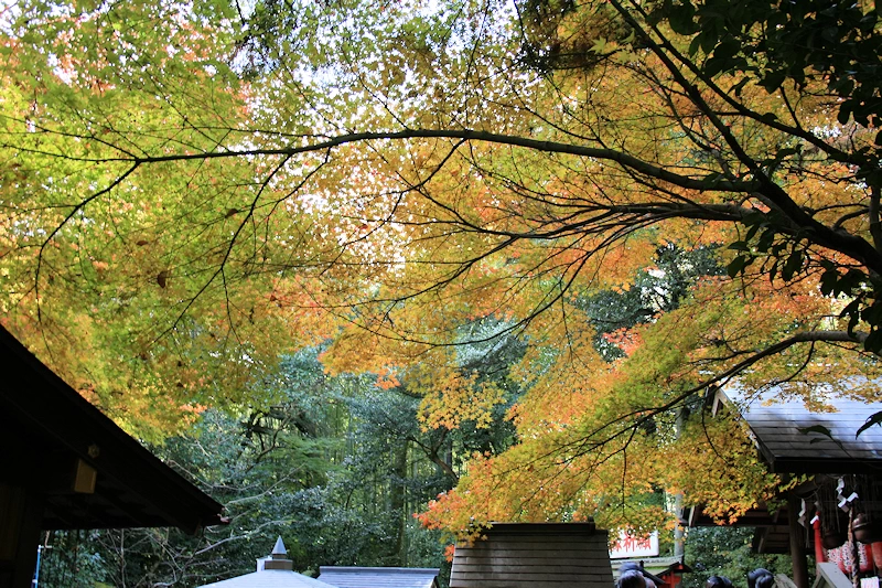 - 樹皮がついたままのクヌギを用いた日本最古の形式を持つ黒木鳥居。この黒い鳥居の周囲を彩る紅葉は、非常にフォトジェニックで、格式高い雰囲気を感じさせる。
