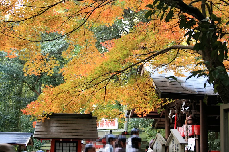 源氏物語にも登場する由緒ある神社で、竹林の「緑」と紅葉の「赤」が織りなすコントラストが非常に美しいスポット