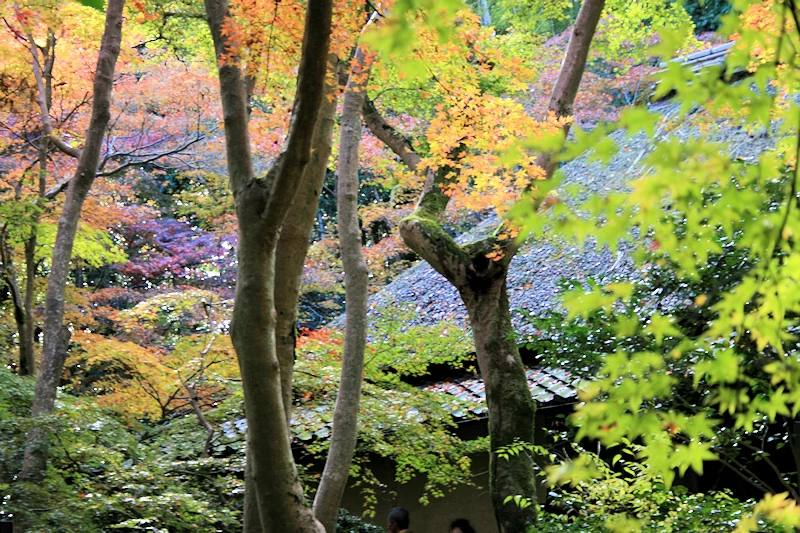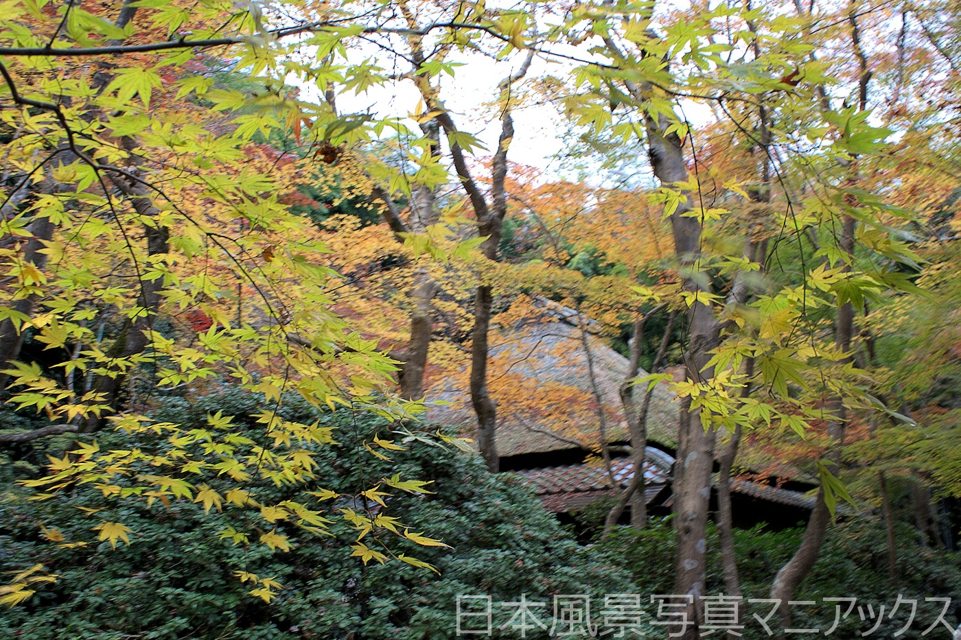 - 草庵にある円窓は、外の光が差し込むと影が虹色に見えることから虹の窓と呼ばれる。窓越しに眺める紅葉の庭園は、格別の趣がある。