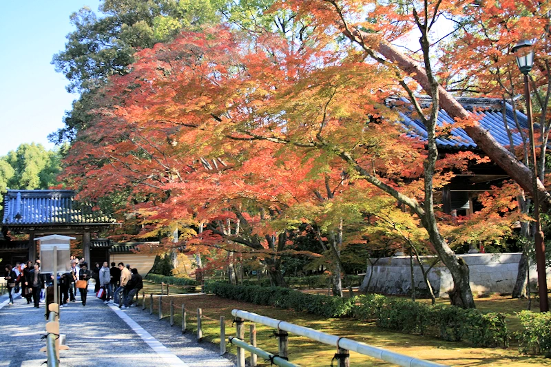 - 山門から境内へ続く参道は、見頃になると紅葉のトンネルのようになり、拝観者を迎えてくれる。