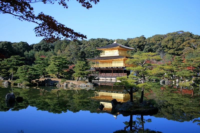 - 最大の見どころは、鏡のように穏やかな鏡湖池に映る逆さ金閣。池の周囲を彩る紅葉が水面に映り込み、黄金色と朱色の幻想的な世界が広がる。