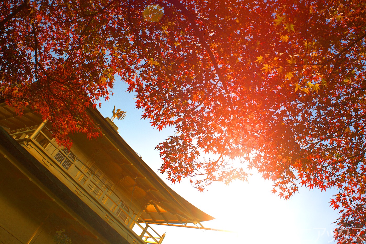 - 鏡湖池(きょうこち)を囲むカエデや、参道に続く紅葉のトンネルが金閣の圧倒的な存在感をさらに引き立てる。