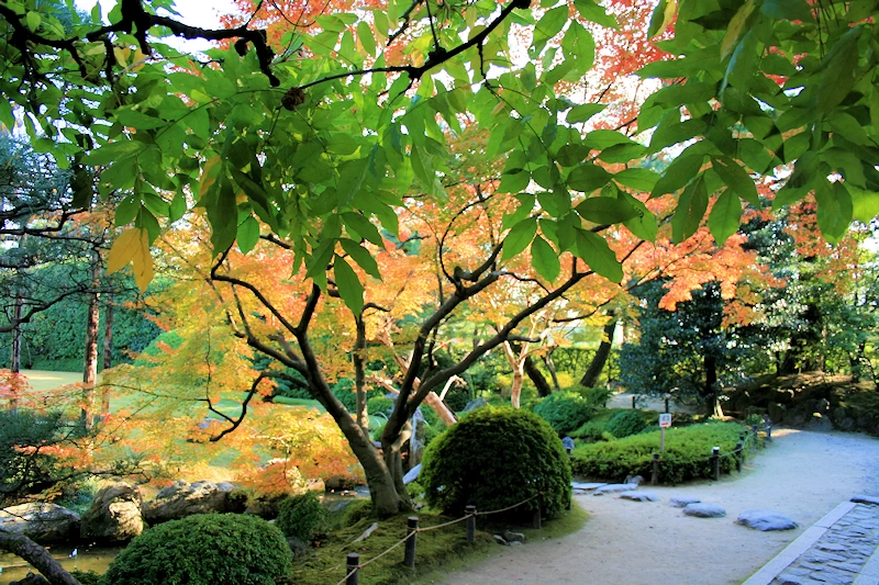 - 室町の庭・桃山の庭では迫力ある石組みや枯山水と紅葉のコントラストが見事。