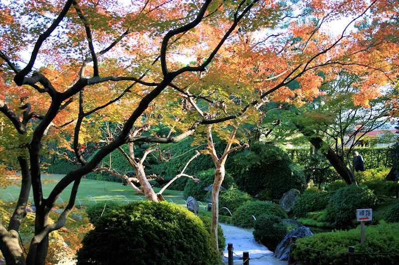 - 5つの庭園からなる広大な神苑「楽水苑」が舞台。京都市中心部の混雑に比べ、比較的落ち着いて紅葉を堪能できる穴場スポット。