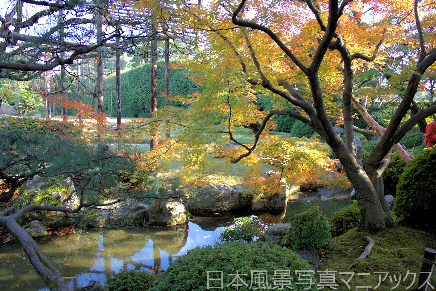 - 平安の庭の池の周りに植えられたモミジが水面に映り込み、平安時代の貴族の庭園を思わせる優美な景色が広がる。