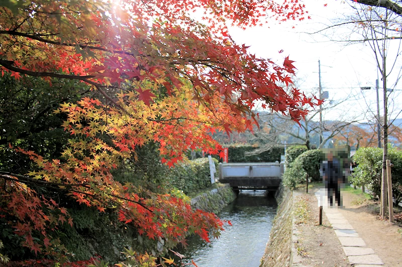 左京区の若王子神社から銀閣寺まで続く約1.5kmの疏水沿いの散歩道。秋には疏水を覆うように紅葉がせり出し、水面に映る逆さもみじや散り際に見られる花筏のような風情を楽しめる