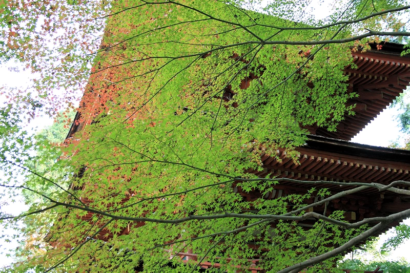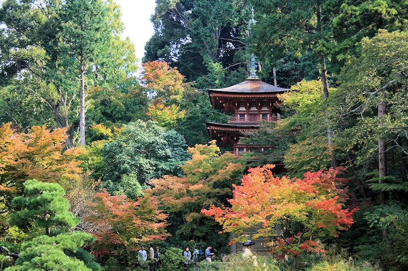 - 穏やかな水面に本堂や三重塔、そして色付いた木々が映り込む様子は、山里の寺院ならではの趣がある。
