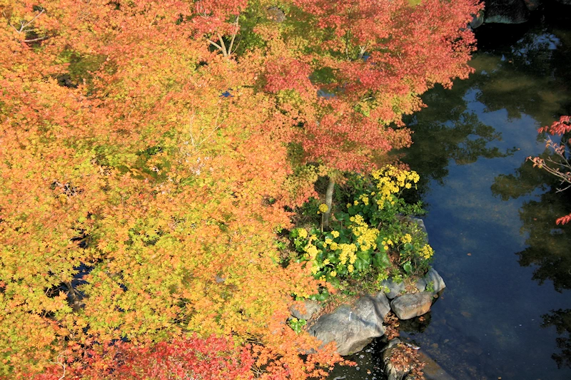 - 高さ約10m、全長123mの歩道橋(観月橋)から庭園全体を見渡せる。水面に映り込む紅葉はまるで絵画のような美しさ。