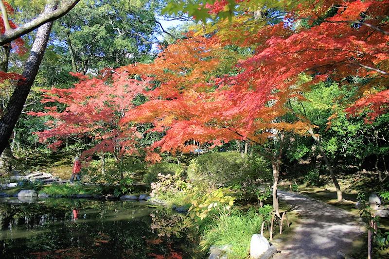 - 西側の芙蓉池庭園は北側に建つ茶室清漣亭とともに、落ち着いた紅葉風景を楽しめる。