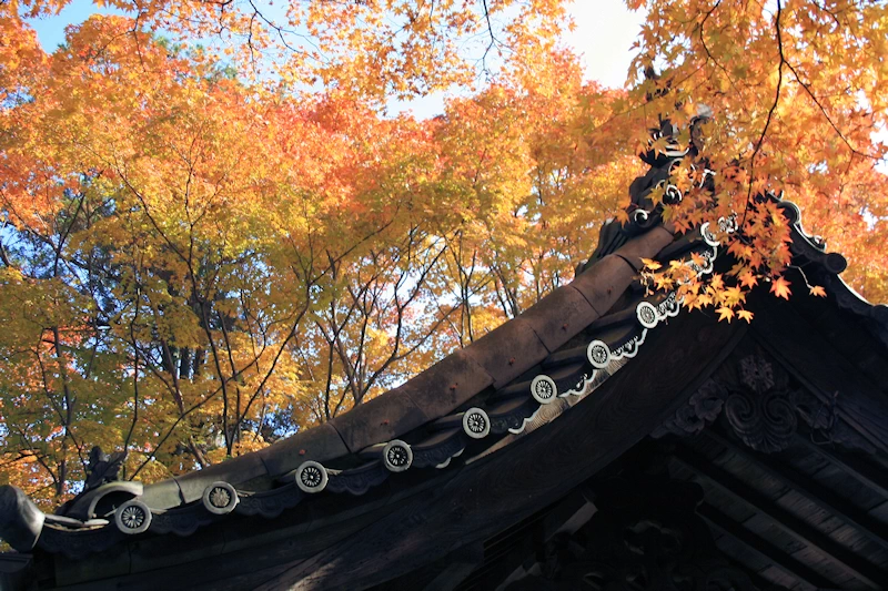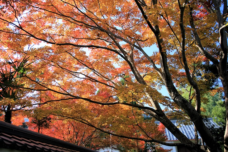 - 伏見城の遺構といわれる天井板(血天井)。紅葉の鮮やかさと、歴史の重みを感じさせる血天井の対比が独特の空気感を生んでいる。