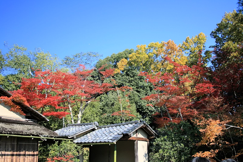 - 境内からは鷹ヶ峰、鷲ヶ峰、天ヶ峰の鷹峯三山を望むことができ、借景として色付く山々のパノラマを楽しめる。