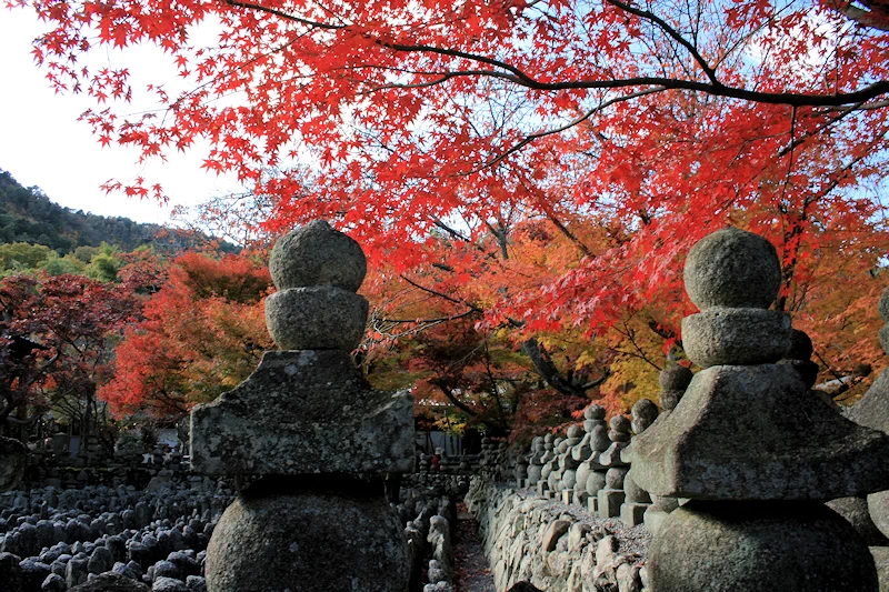愛宕念仏寺の紅葉は、嵐山・嵯峨野エリアの中でも最も奥まった場所に位置し、1,200体の羅漢像と紅葉の共演が楽しめる唯一無二のスポット