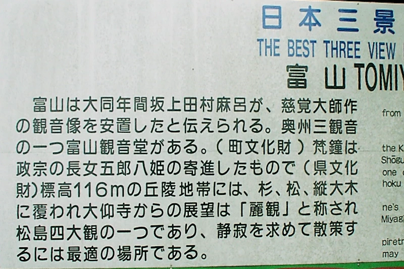・富山は松島四大観の一つ「麗観」と呼ばれている ・松島として「美しい日本の歴史的風土100選」に選定されている ・松島として「都市公園100選」に選定されている ・松島は日本三景の一つ。他の二つは「天橋立」と「安芸の宮島」です。 ・松島四大観→「幽観・扇谷(松島町)」「麗観・扇谷(松島町)」「偉観・多聞山(七ヶ浜町)」「壮観・大高森(松島町)」 |