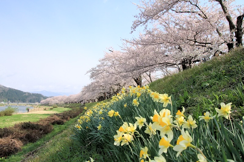 ・黒板塀が続く静謐な町並みに、約450本のシダレザクラが降り注ぐように咲き誇る ・162本のシダレザクラが国の天然記念物に指定されており、中には樹齢300年を超える巨木もある ・格式高い武家屋敷の黒板塀と、可憐なピンクの花びらのコントラストが非常に美しく、人力車での散策も人気 ・武家屋敷通りのすぐ近くを流れる桧木内川の左岸には、約2kmにわたるソメイヨシノの並木が続く ・約400本の桜が一斉に咲き、圧倒的なスケールの「桜のトンネル」を作り出す ・広々とした堤防沿いは、武家屋敷通りとは対照的な開放感があり、ゆったりとしたお花見が楽しめる ・入園料 無料 ・専用駐車場 あり ・「日本桜名所百選」に選定されている |