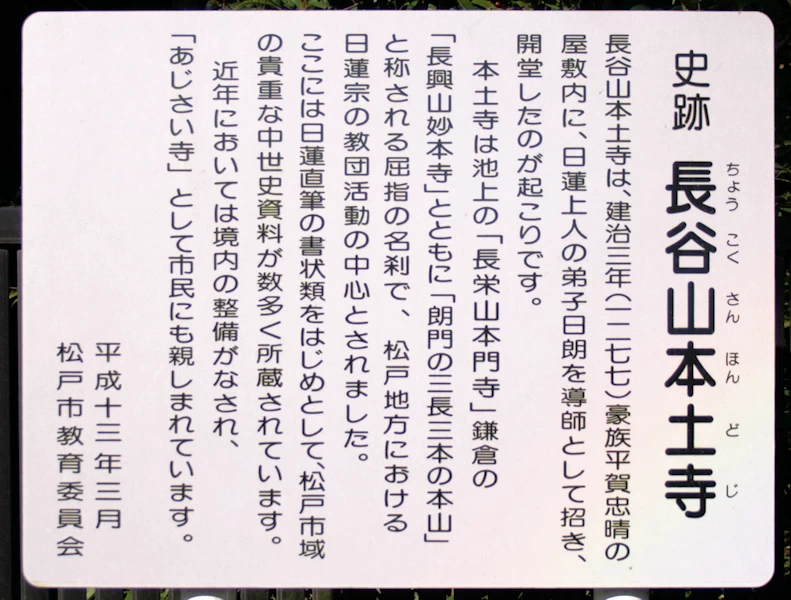 ・日蓮宗寺院 ・日蓮直筆の書状類を保管 ・あじさいの寺、紅葉の寺と呼ばれている ・拝観時間 5:00~17:00(最終 16:30)、※有料参拝期間は9:00~16:30(最終 16:00) ・拝観料金 無料。※中高生以上500円、団体400円(20名以上)、障害者300円 ・専用駐車場 あり |