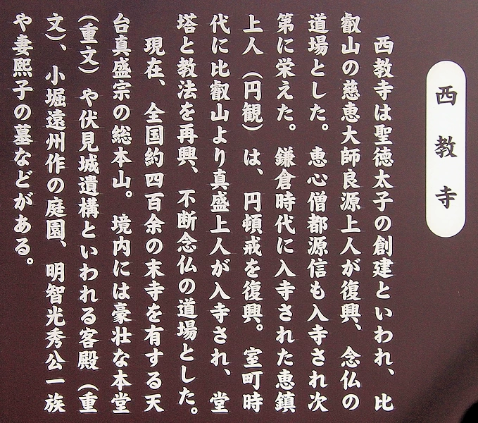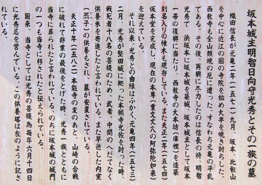 ・天台真盛宗総本山の寺院 ・宗祖は真盛上人 ・本尊は阿弥陀如来坐像 ・重要文化財は本堂と客殿 ・明智光秀の菩提寺 ・明智一族の墓がある ・拝観時間 9:00~16:30 (入場は16:00まで) ・拝観料 大人500円、中学生300円、小学生200円、身障者200円(団体割引20名以上で450円) ・専用駐車場 あり ・坂本比叡山口駅から徒歩で向かうのは結構大変です |